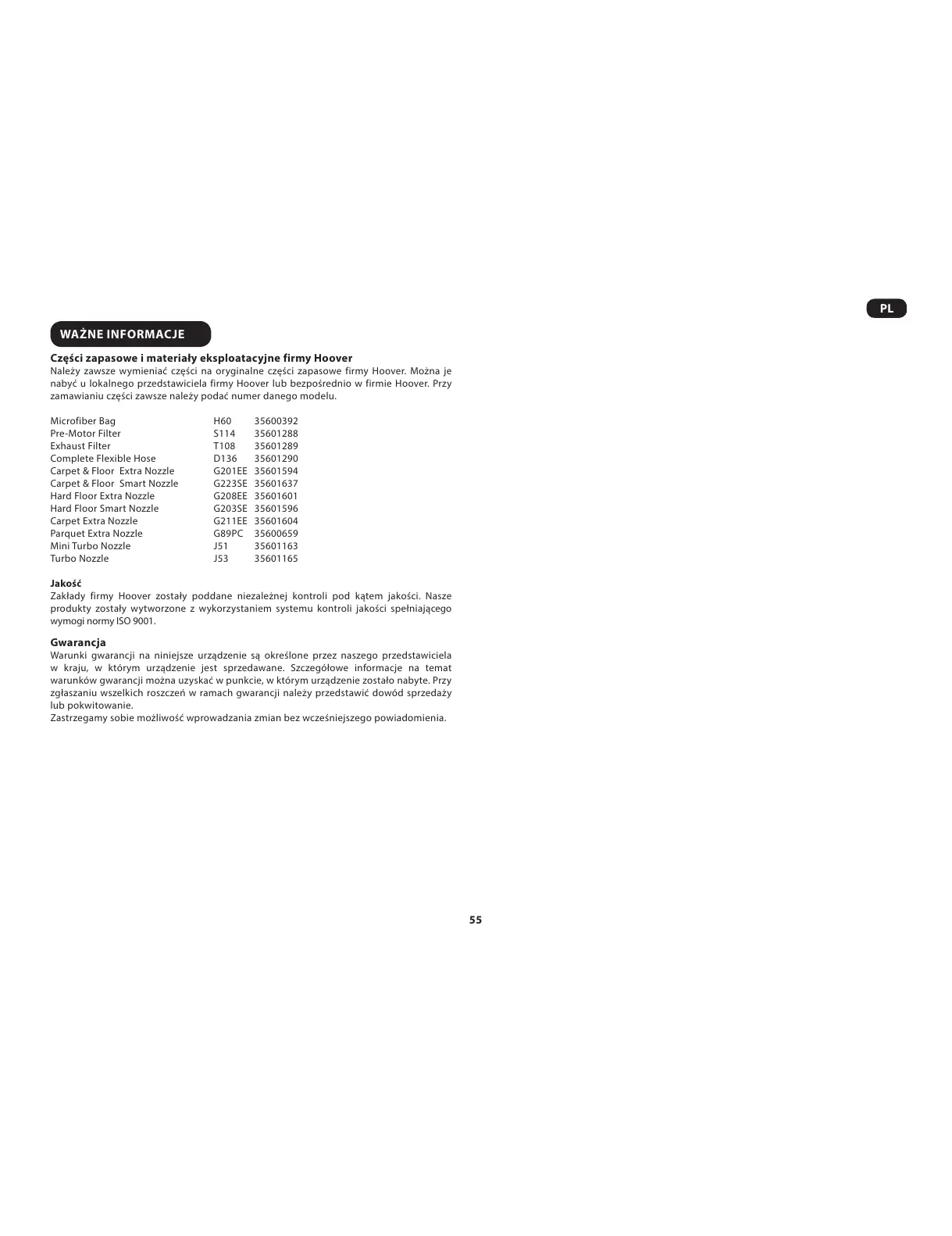 Należy zawsze wymieniać części na oryginalne części zapasowe firmy Hoover. Można je
