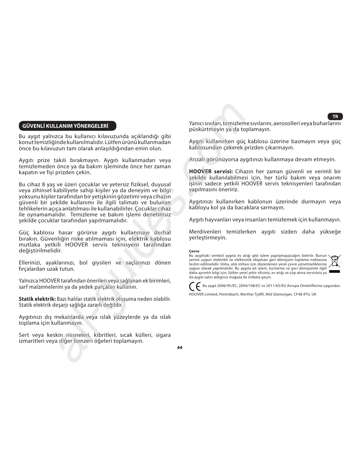 mutlaka yetkili HOOVER servis teknisyeni tarafından