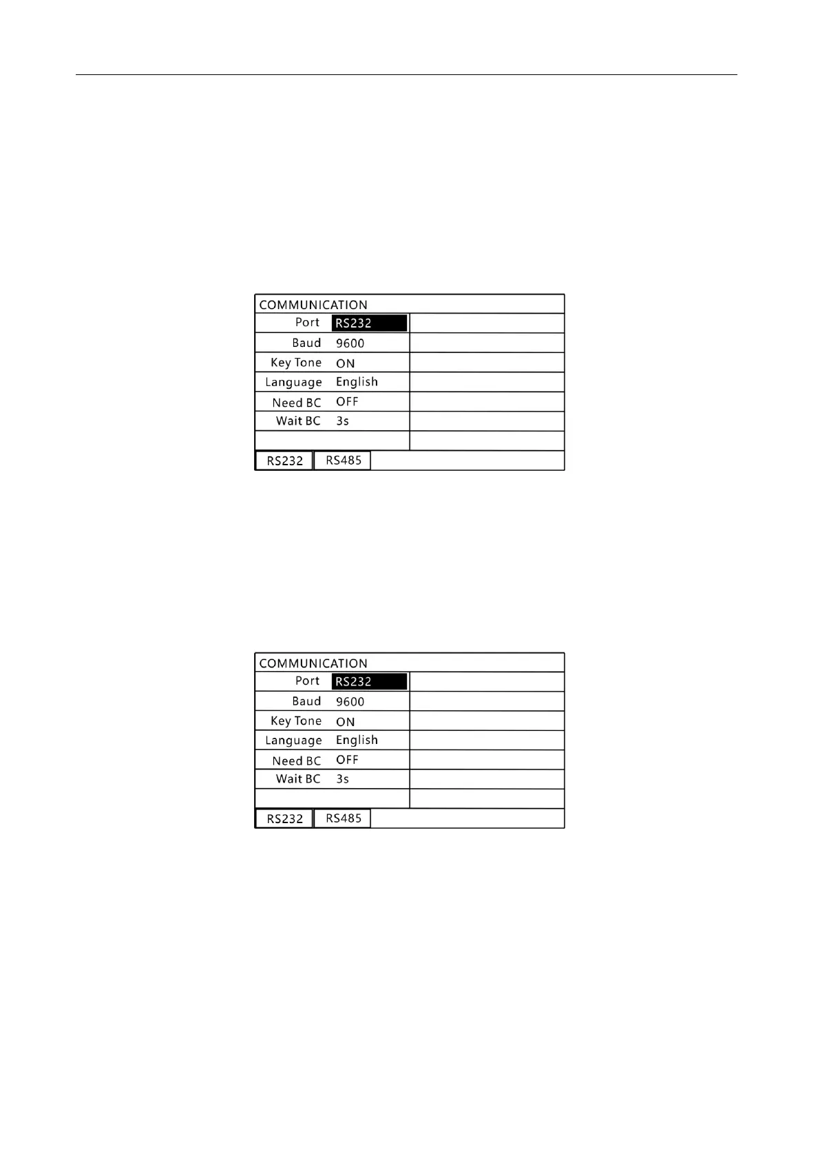 In this interface, use the function keys to select the required communication port.