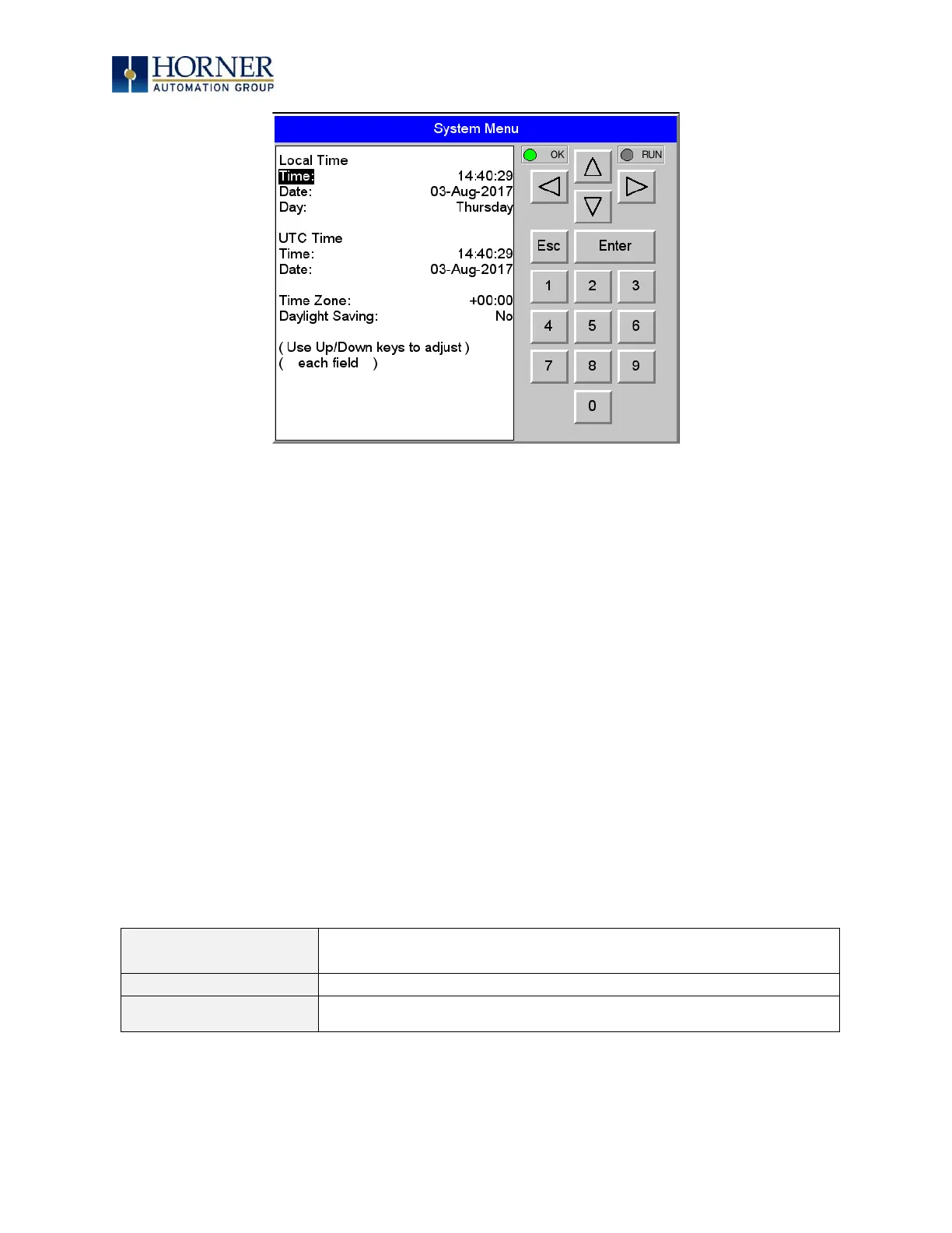 NOTE: Time and Date are split into three fields each, all of which may be edited. Touch the field