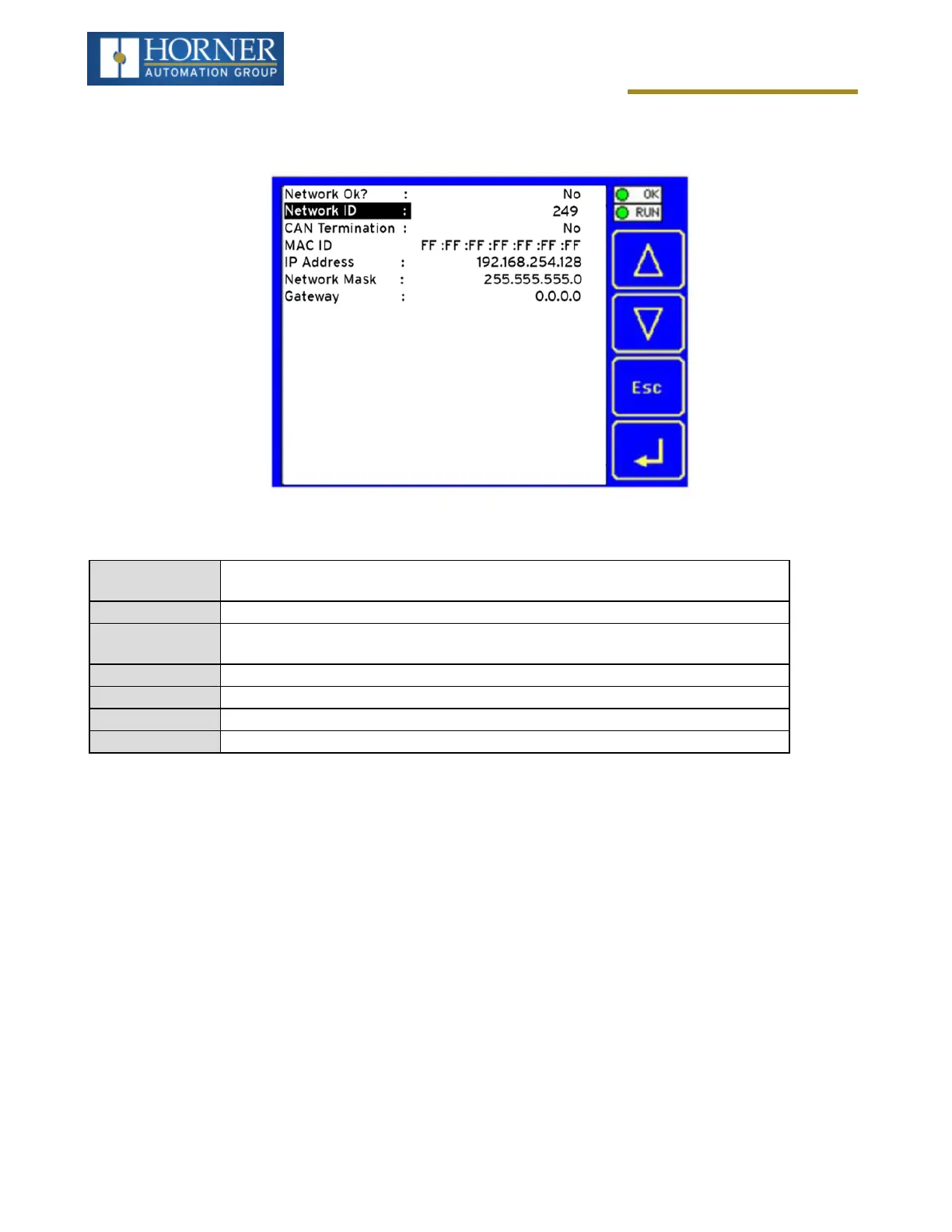 This sub menu allows setting for the CAN and Ethernet network to be viewed or changed.