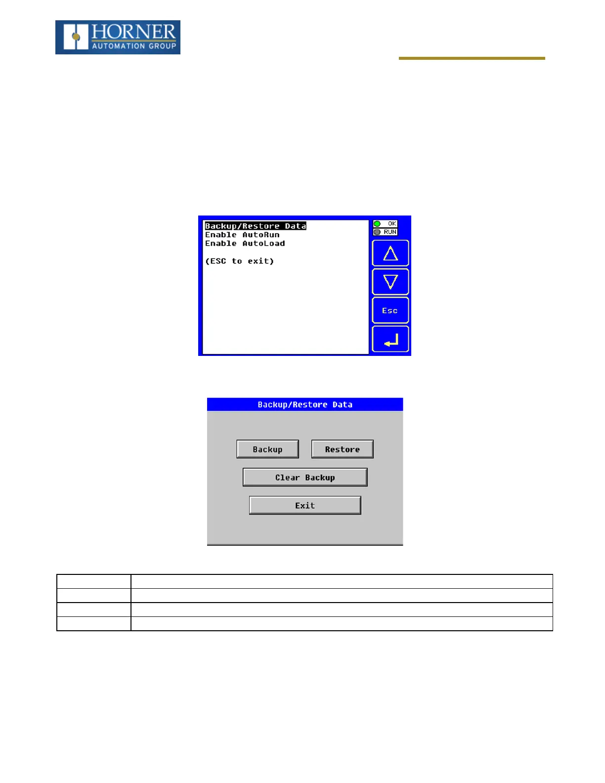Backup = Copies battery-backed RAM contents on to the onboard flash memory of the OCS.