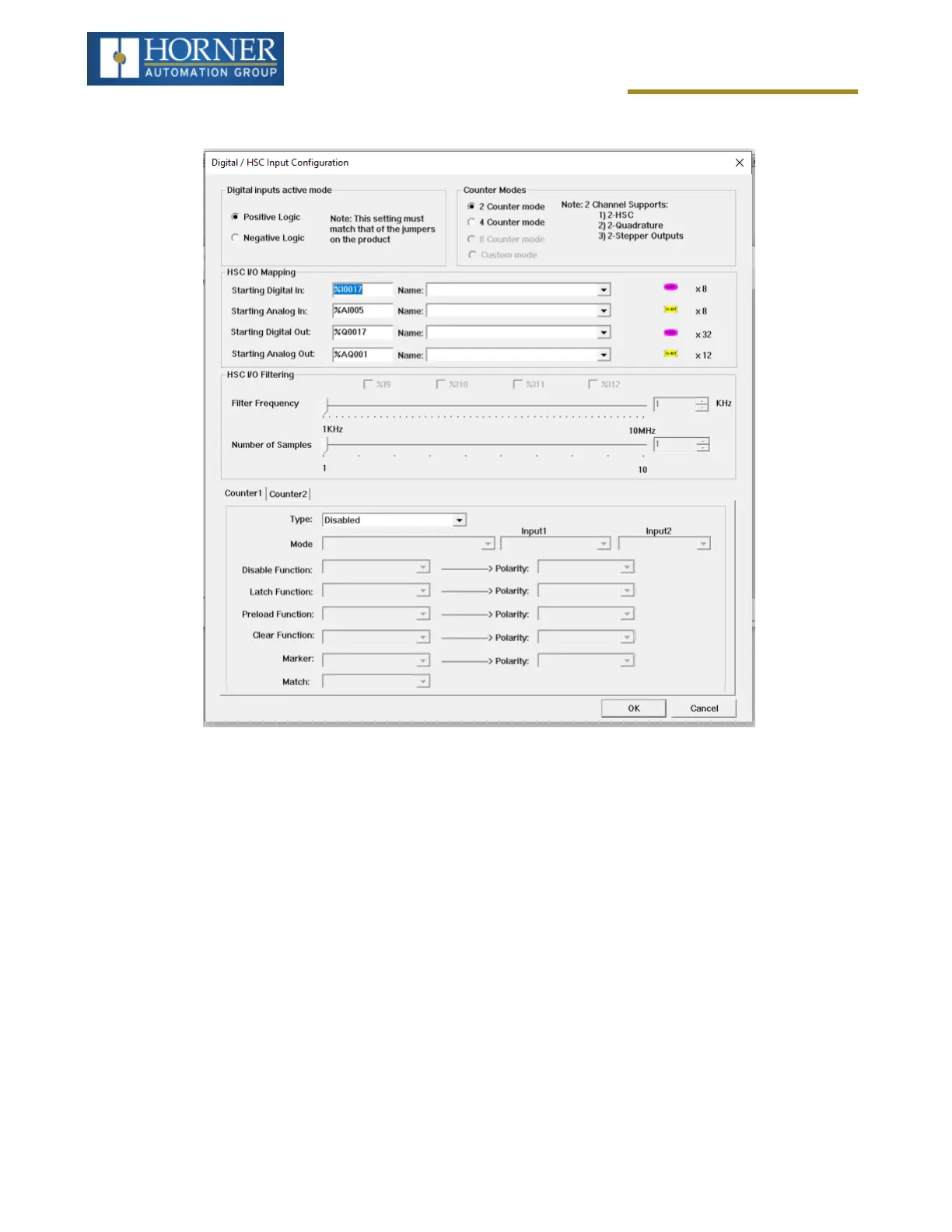 speed counters on the Horner OCS. To configure a counter, the user needs to set the type, mode, and counts per