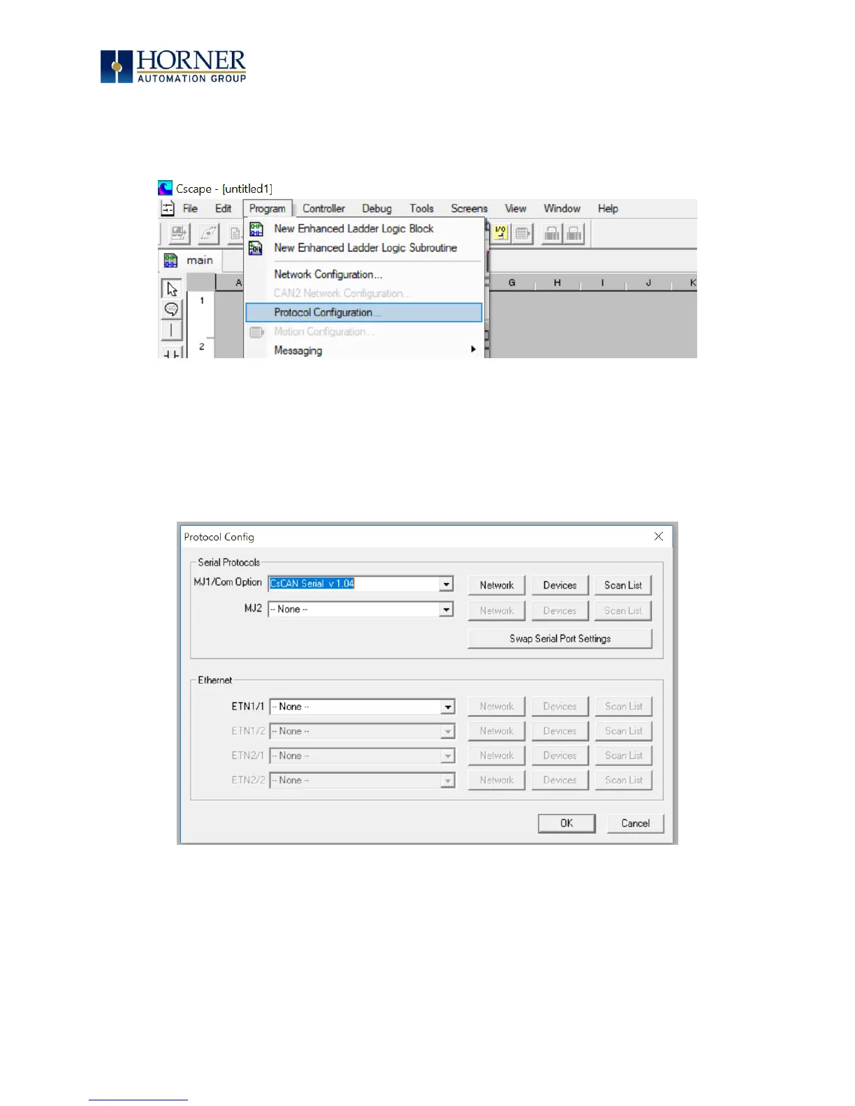 After opening Cscape, choose Program → Protocol Config.