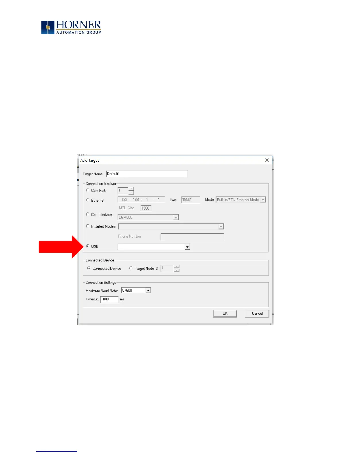T and later. To load via USB configure the communications port in Cscape as follows, the unit