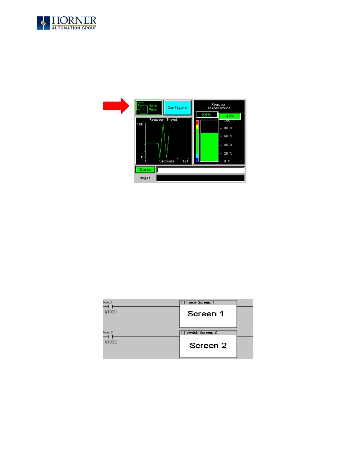 Ladder logic can use several techniques to control screen navigation. Coils can be tied to %D