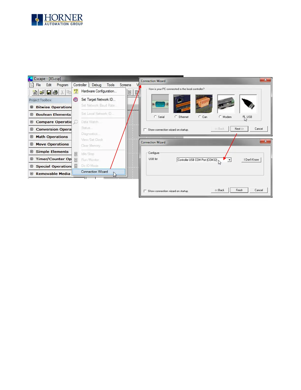 Cscape tool bar) → Connection Wizard, choose your connection method. If you are connecting