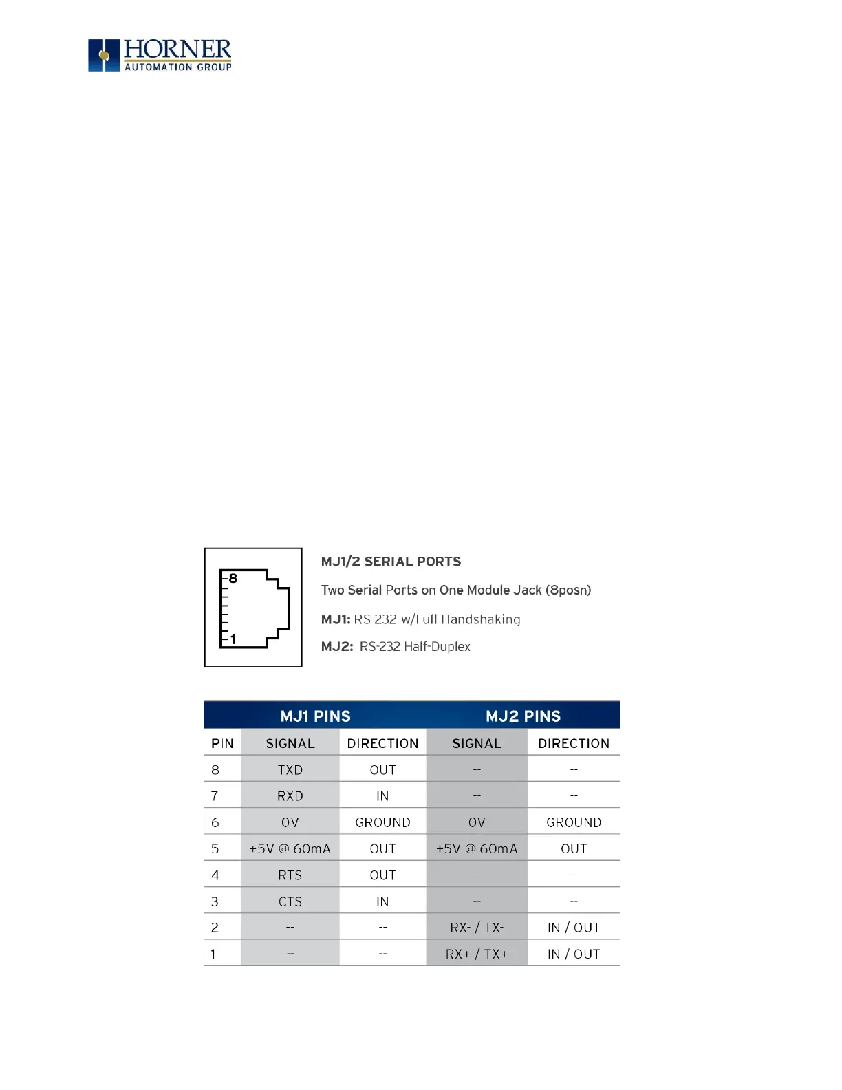 The MJ2 serial port contains half-duplex RS-485 interface with no handshaking. The MJ2 RS-