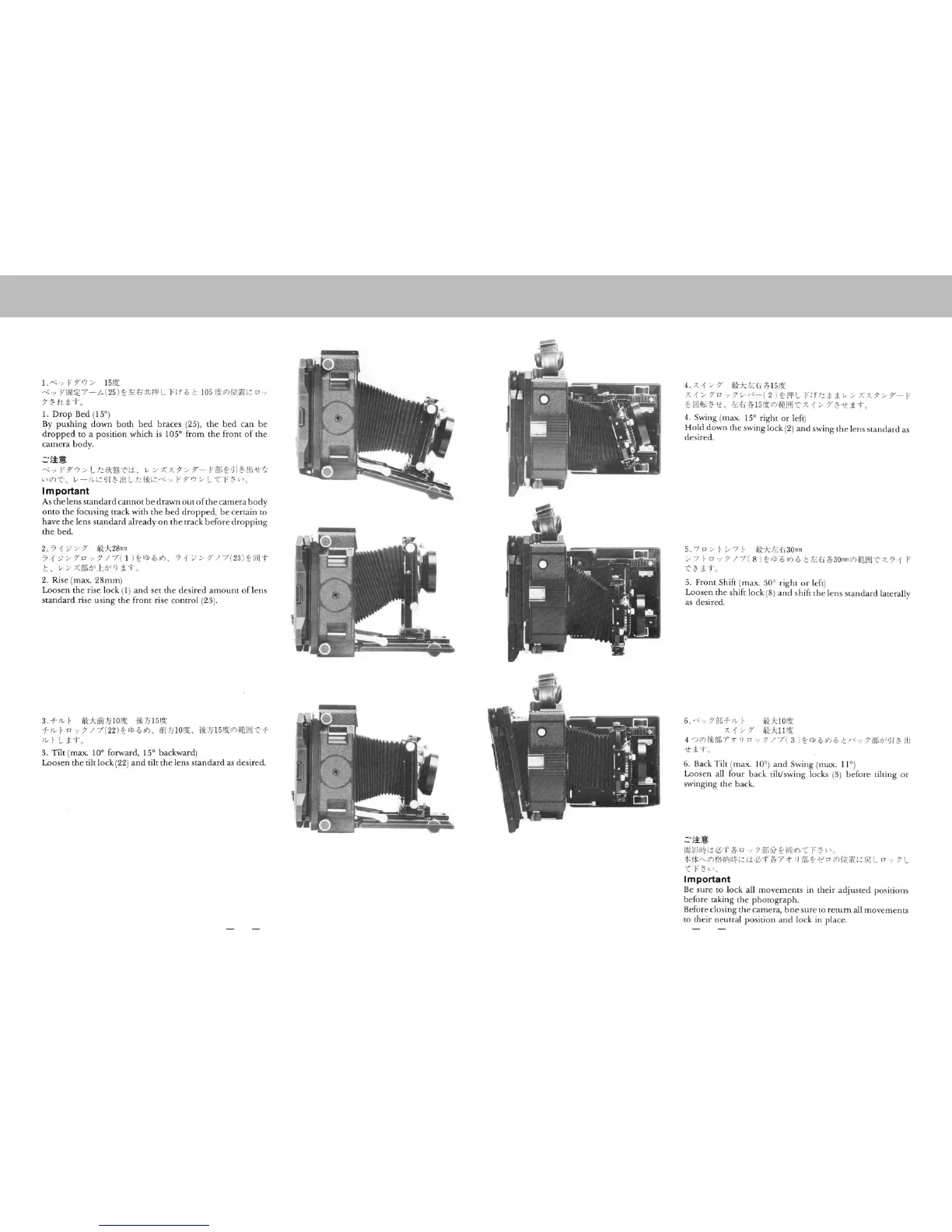 Horseman 45FA - Camera Movements; Drop Bed (15°); Rise (max. 28 mm); Tilt (max. 10° forward, 15° backward)