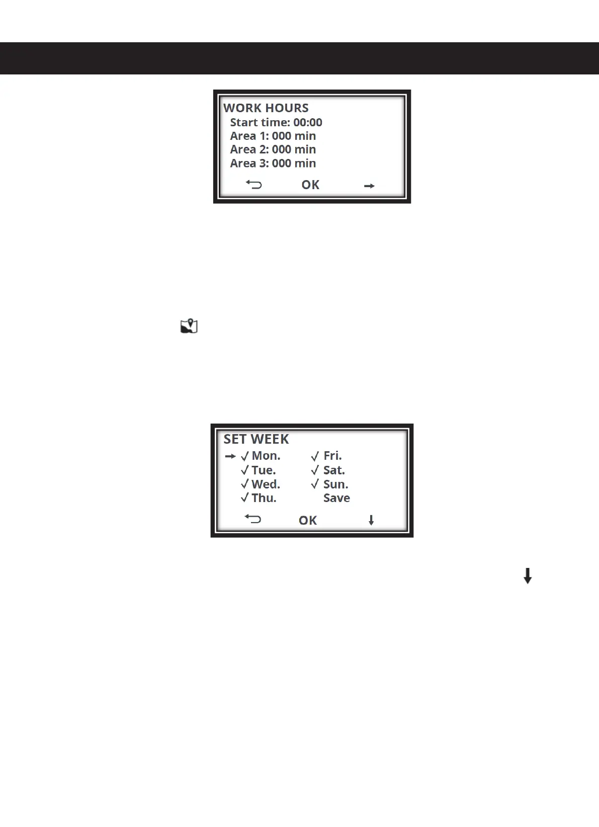 5. SET WEEK. Define the days on which the mower should work. To do this, select "Work