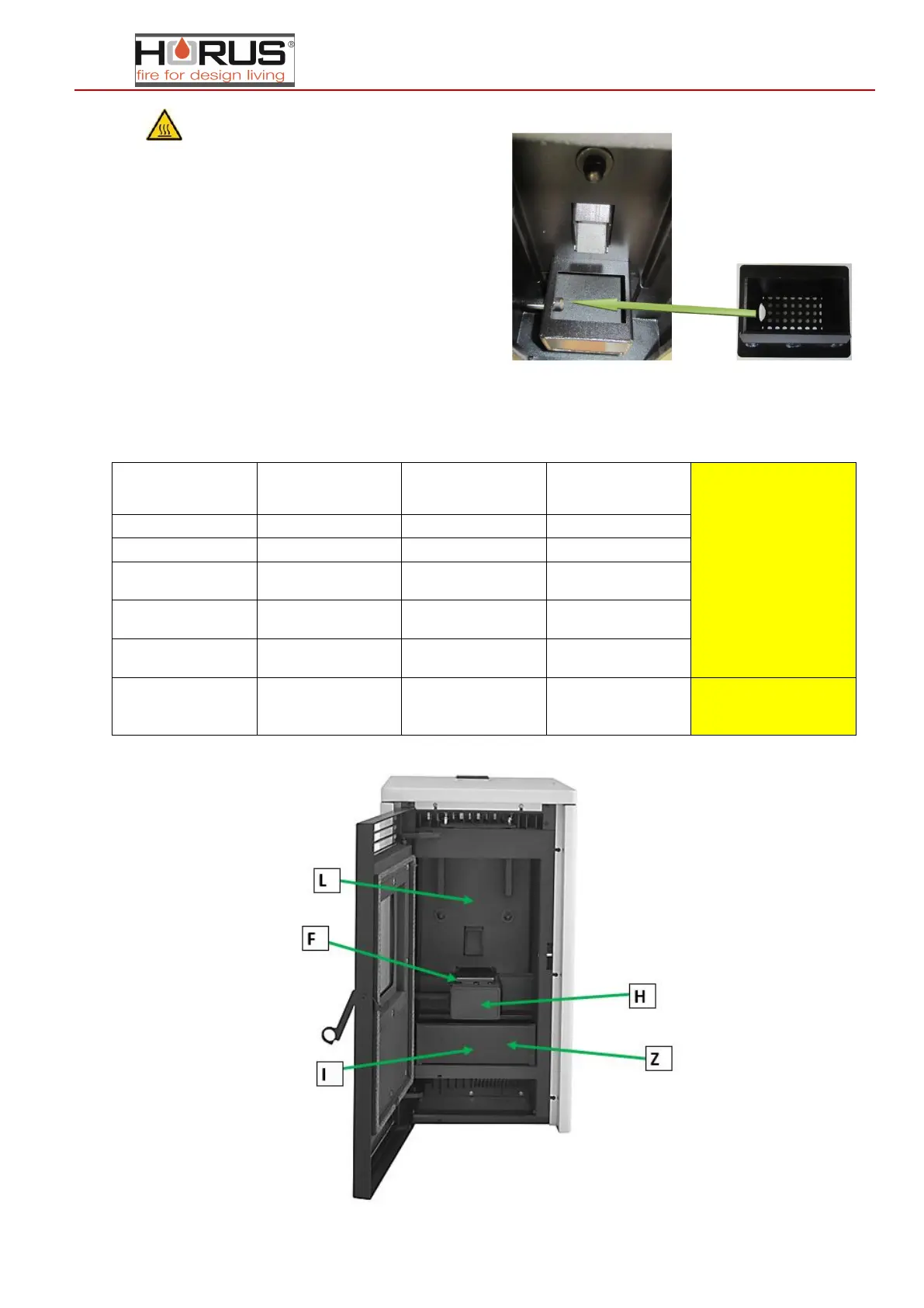 Belangrijk: de vuurpot schoonmaken bij elk opnieuw inschakelen (Pos. F), de aslade reinigen om de 2-3 dagen (Pos.I ), de vlammenafdekking