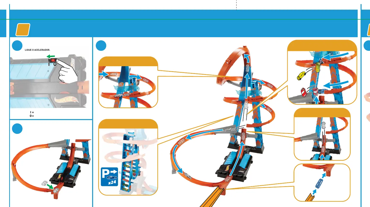 PARTES! • SUIVEZ LES ÉTAPES CI-DESSOUS POUR PLIER LES SECTIONS DE PISTE ET EMPORTER LA TOUR! • SIGA AS ETAPAS ABAIXO PARA DOBRAR AS PEÇAS DA PISTA E LEVAR A TORRE COM VOCÊ!