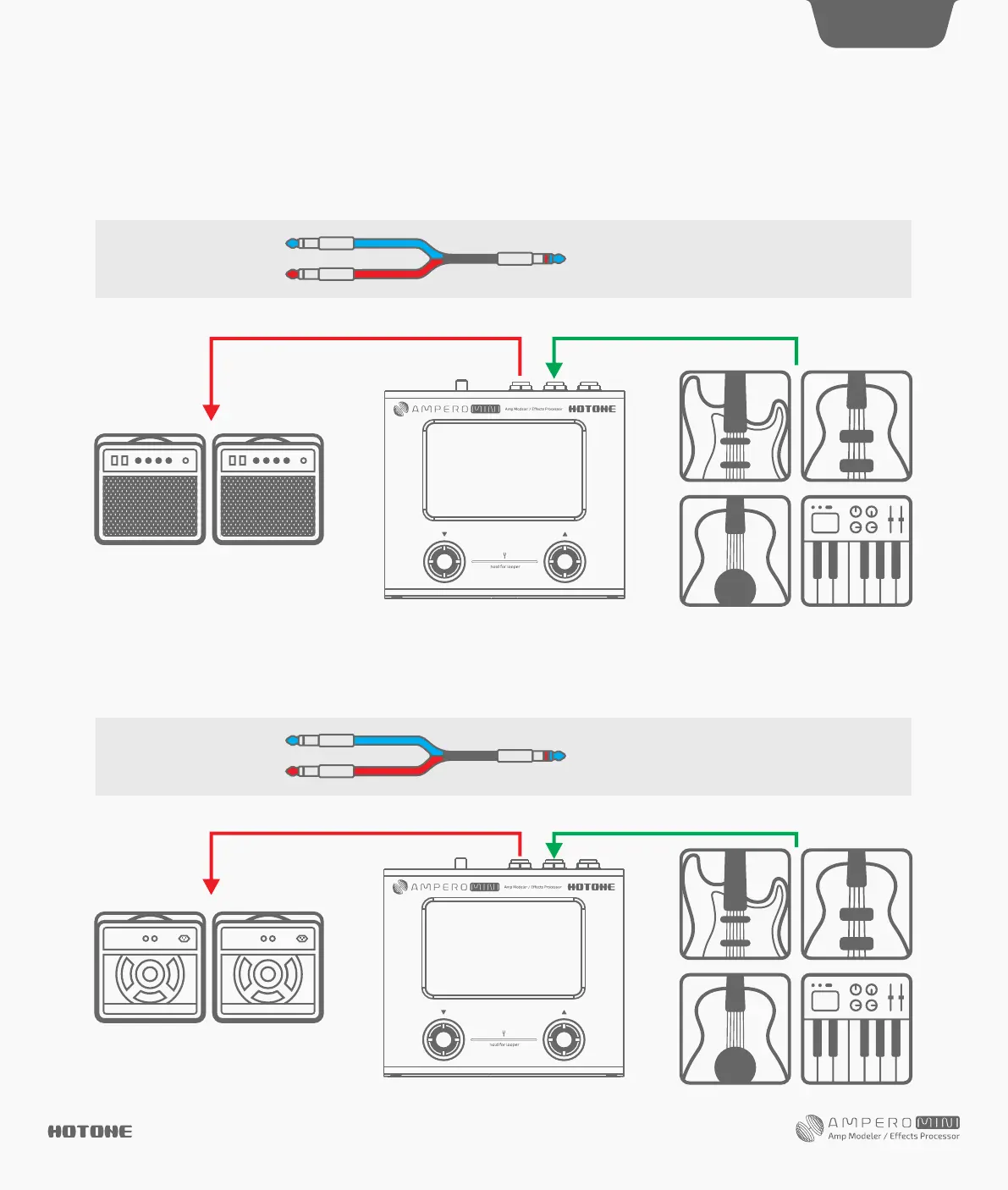 Plug your instrument into the Ampero Mini instrument IN jack, and run a cable from the OUT to your amplifier (s). For stereo connection, a Y cable is