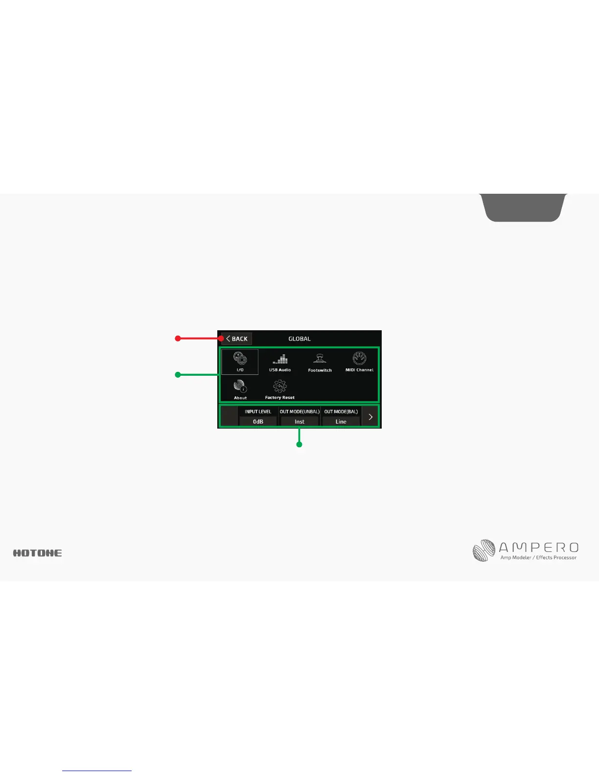 Use the GLOBAL menu to set Ampero’s global functions, including I/O and MIDI channel settings. You can also return to factory settings from this menu.