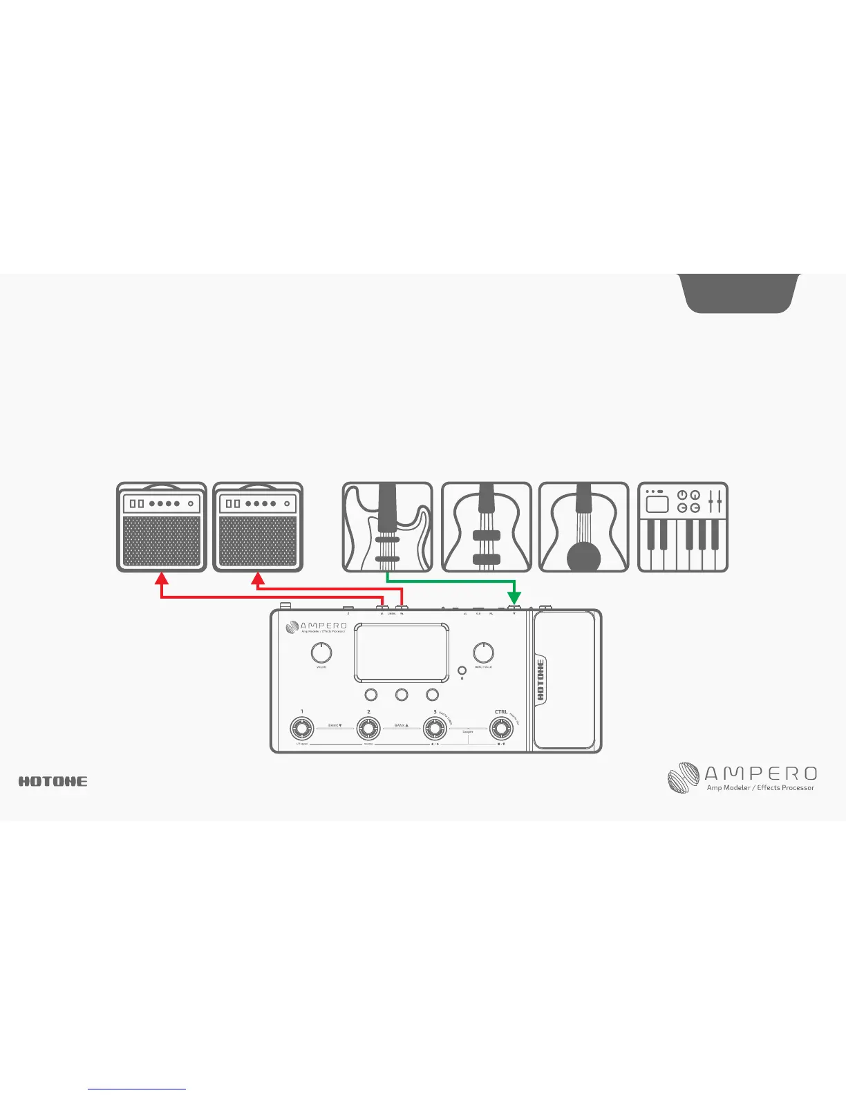 Plug your instrument into the Ampero instrument IN jack, and run a cable (or two) from the unbalanced OUT to your amplifier(s). If you have one amp, run the cable from
