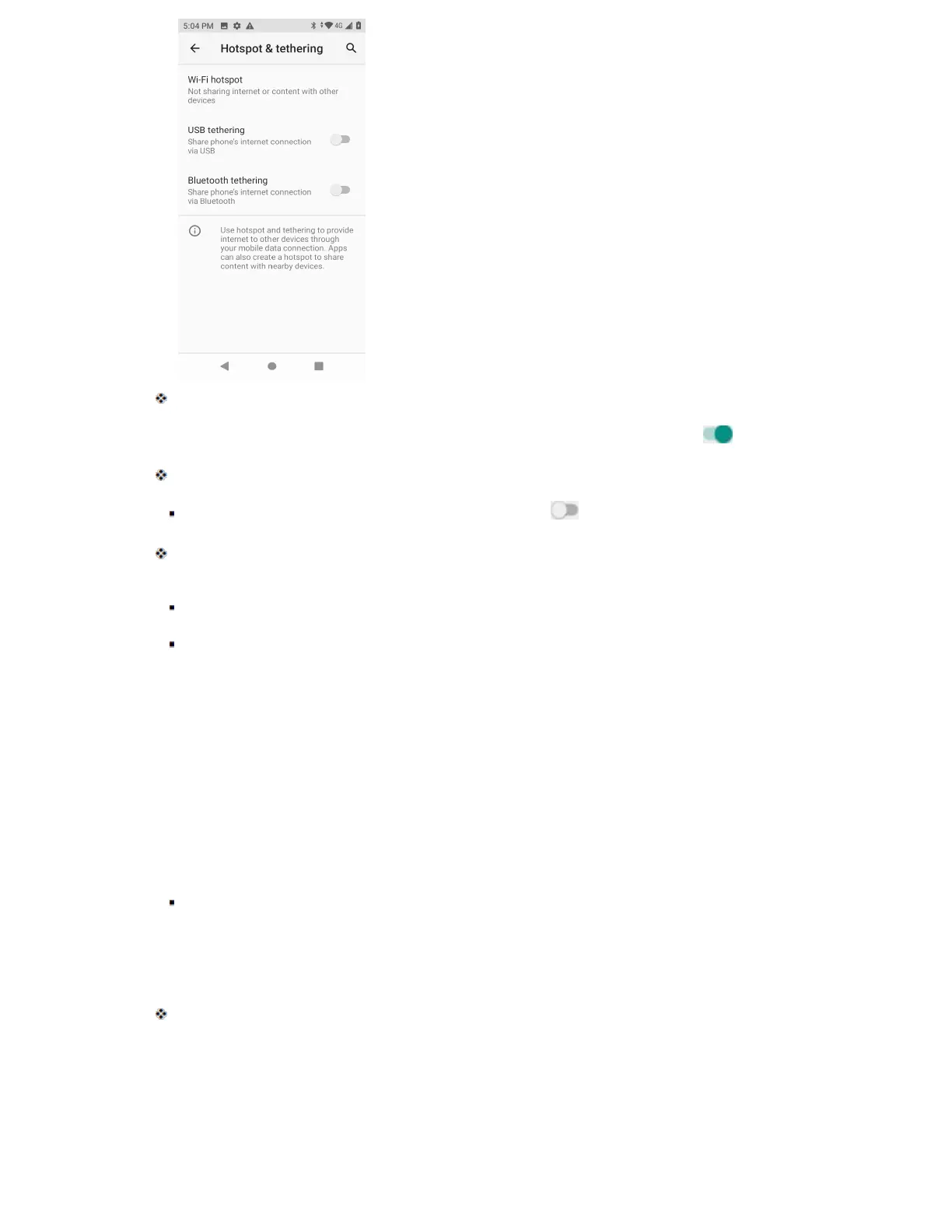 3. Tap the slider to turn Mobile Hotspot, USB tethering or Bluetooth tethering on .