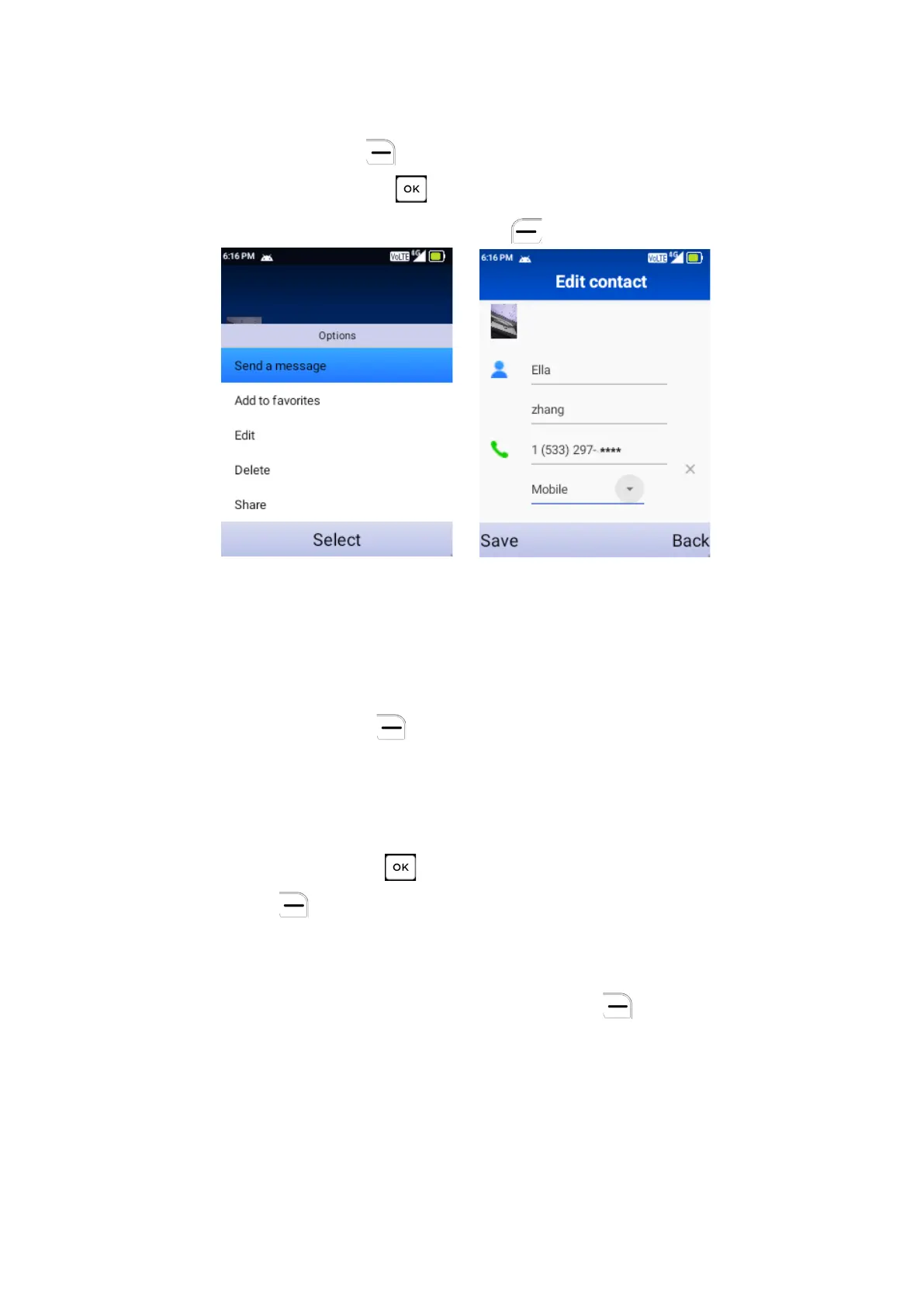 On the Contacts screen, use the Navigation Key to select a Contact, then