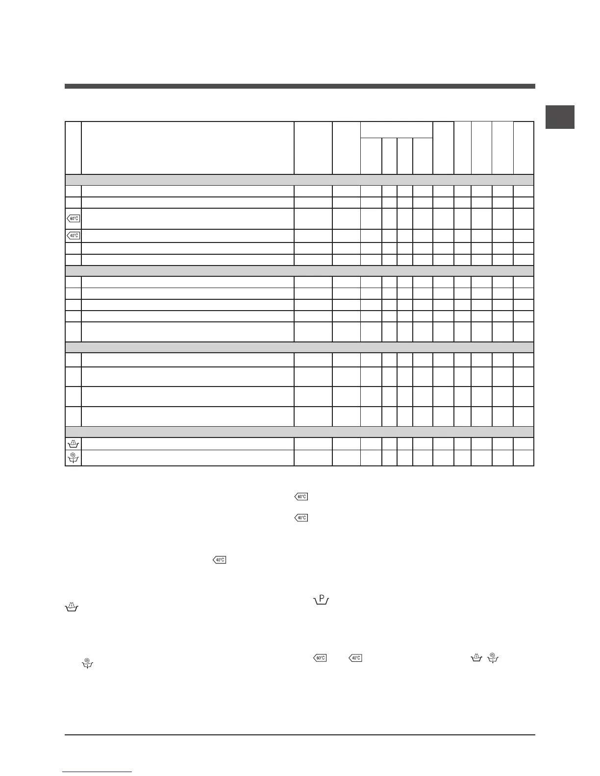Table of programmes and wash cycles