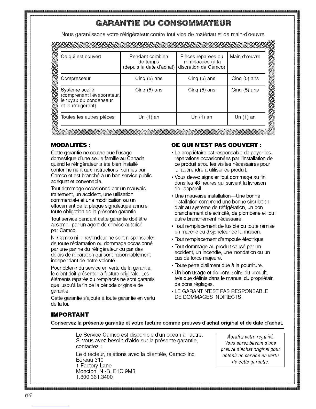 Nous garantissons votre refrig6rateur contre tout vice de materiau et de main=d'oeuvre.