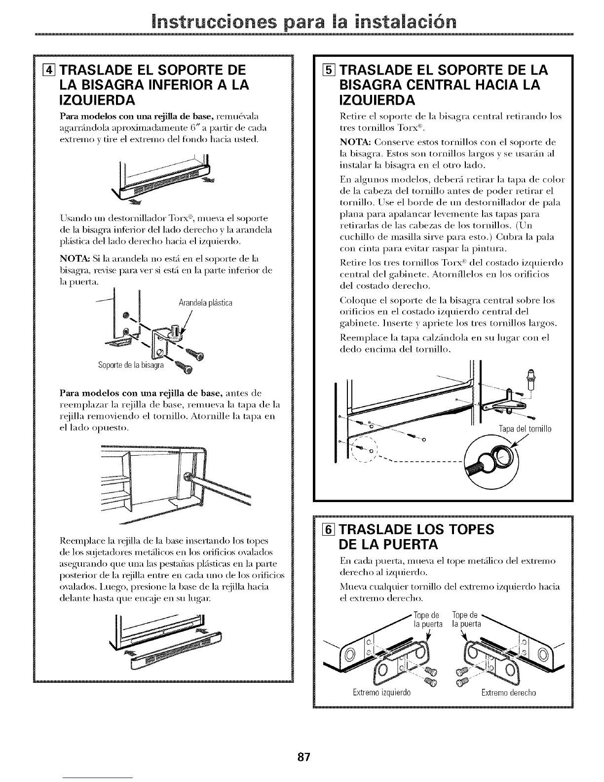 de la bisagra inferior del lado derecho v la arandela