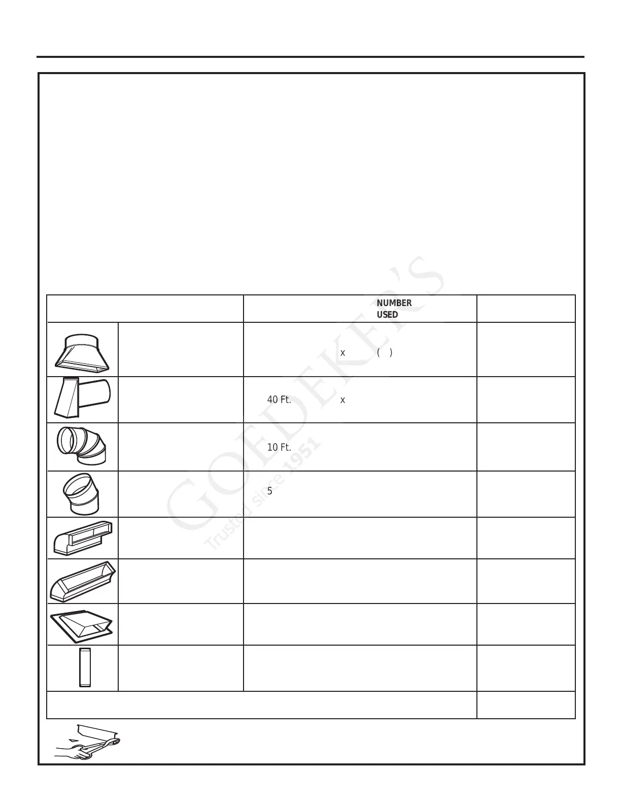 DUCT PIECES LENGTH x USED = LENGTH