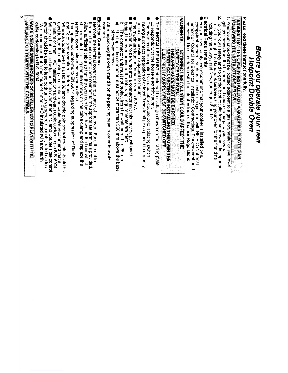 Hotpoint BD31 - Installation and Electrical Setup; Electrical Connection Requirements; Key Installation Safety Warnings