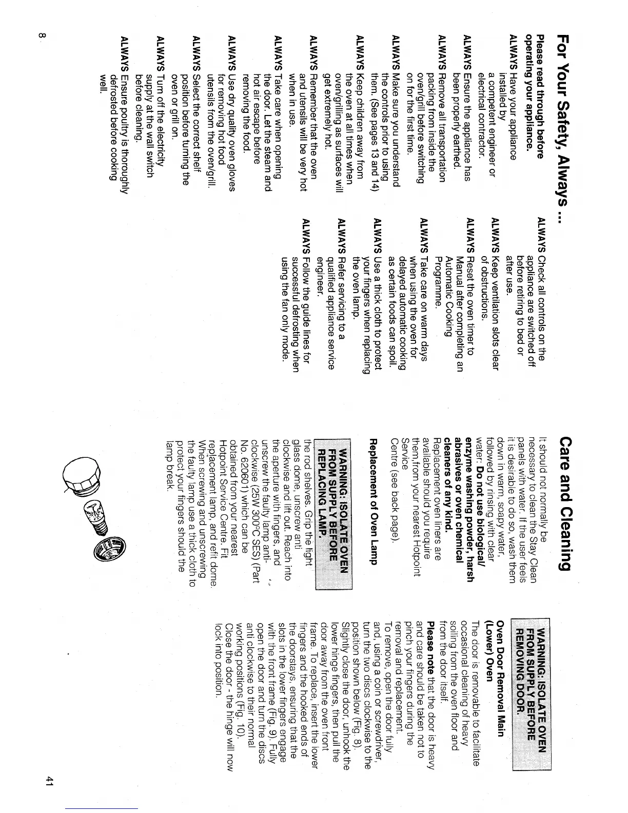Hotpoint BD81 - Safety Guidelines; General Safety Precautions; Oven Lamp Replacement; Oven Door Removal