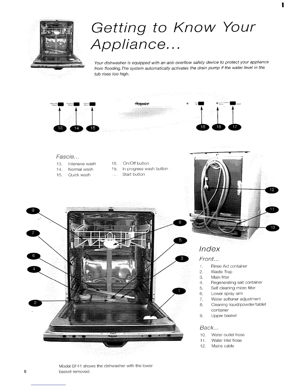 Hotpoint BF41 - Getting to Know Your Appliance; Index; Front; Back