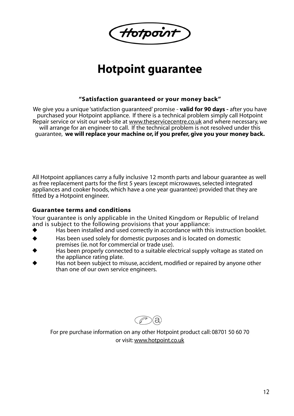 For pre purchase information on any other Hotpoint product call: 08701 50 60 70