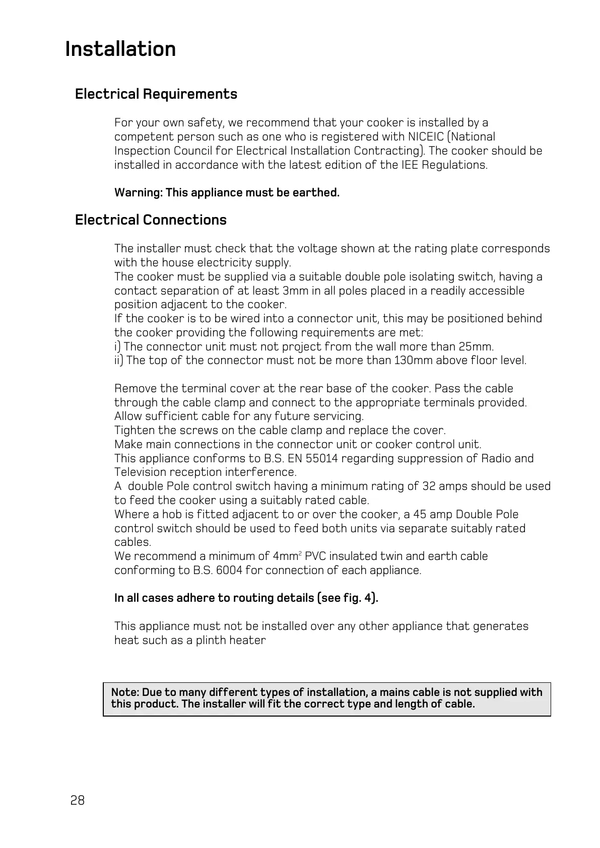 The cooker must be supplied via a suitable double pole isolating switch, having a