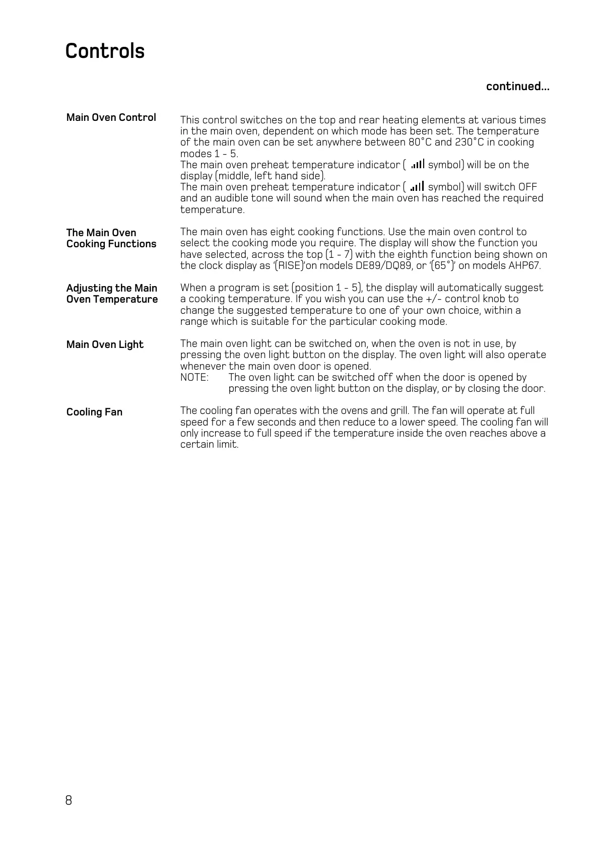 in the main oven, dependent on which mode has been set. The temperature