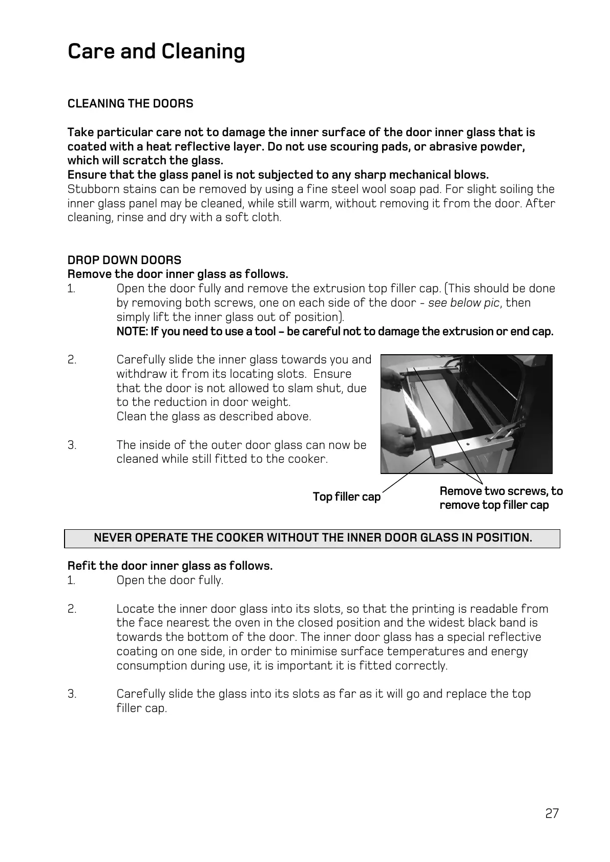 NEVER OPERATE THE COOKER WITHOUT THE INNER DOOR GLASS IN POSITION.