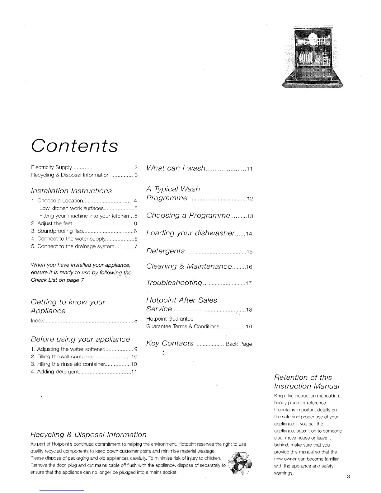 Hotpoint DF53 - Recycling and Disposal Information; Installation and Setup Guide; Location and Leveling; Water and Drainage Connection