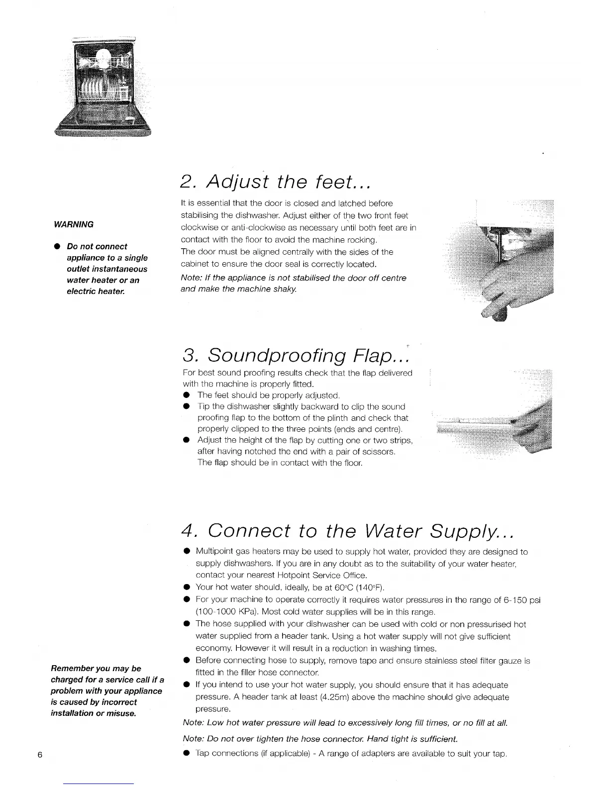 Hotpoint DF53 - Appliance Leveling and Stability; Water Supply Connection Details