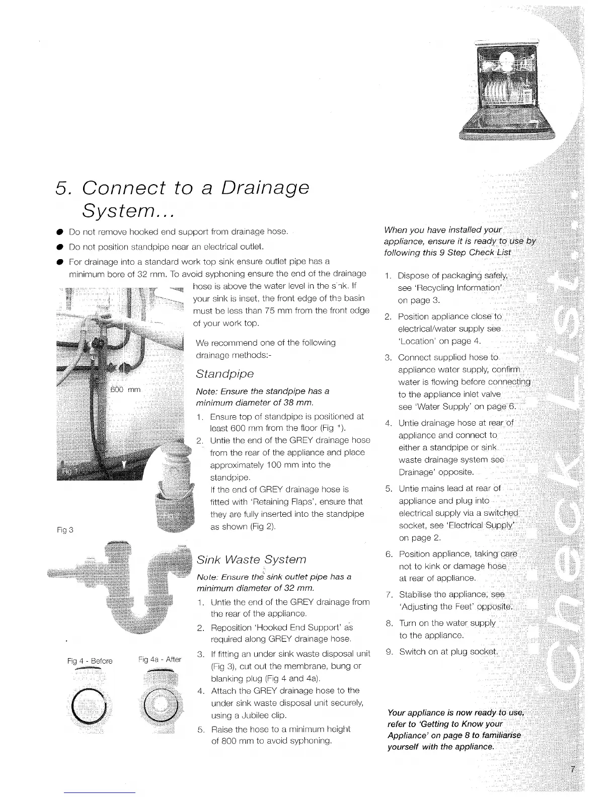 Hotpoint DF53 - Drainage System Connection Methods; Installation Readiness Checklist