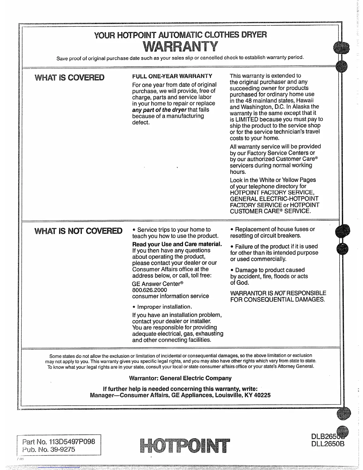 Saveproofoforiginalpurchasedatesuch asyour sales slip or cancelled check to establishwarranty period.