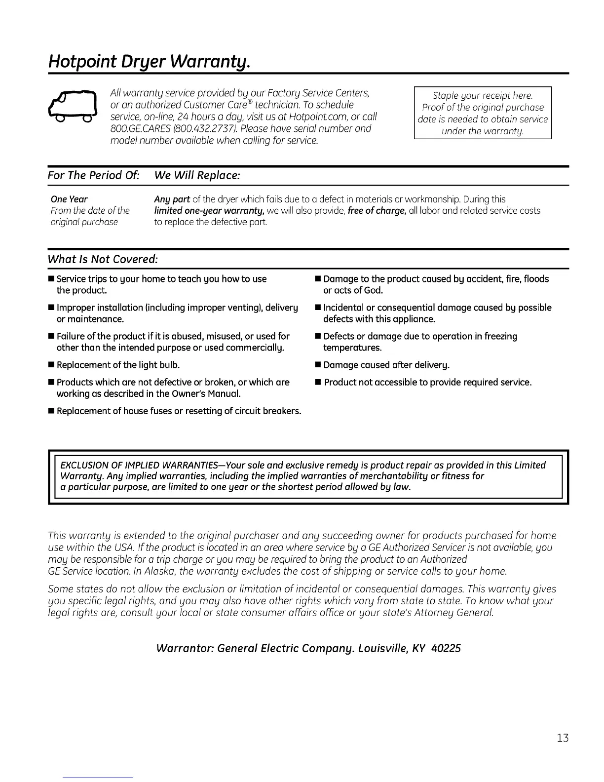 Warrantor'. General Electric Compang. Louisville, KY 40225