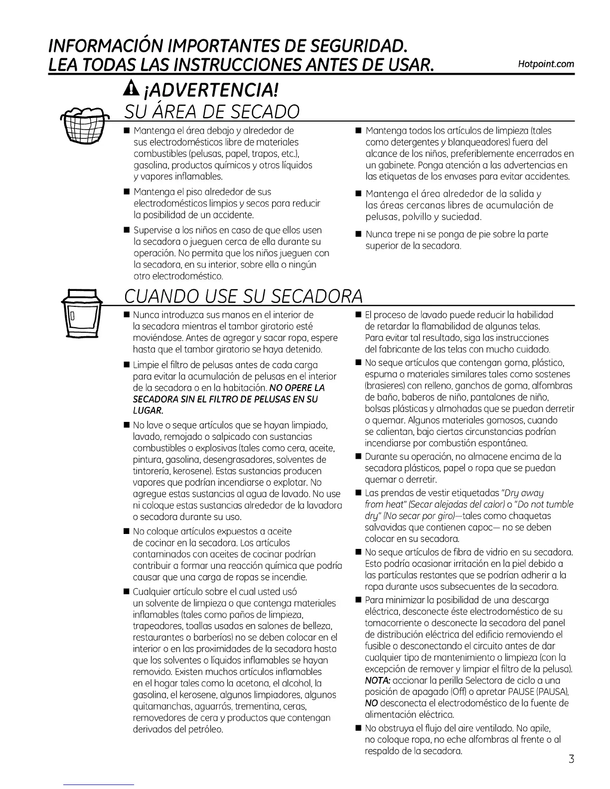 de la secadora o en la habitaci6n. NO OPERELA