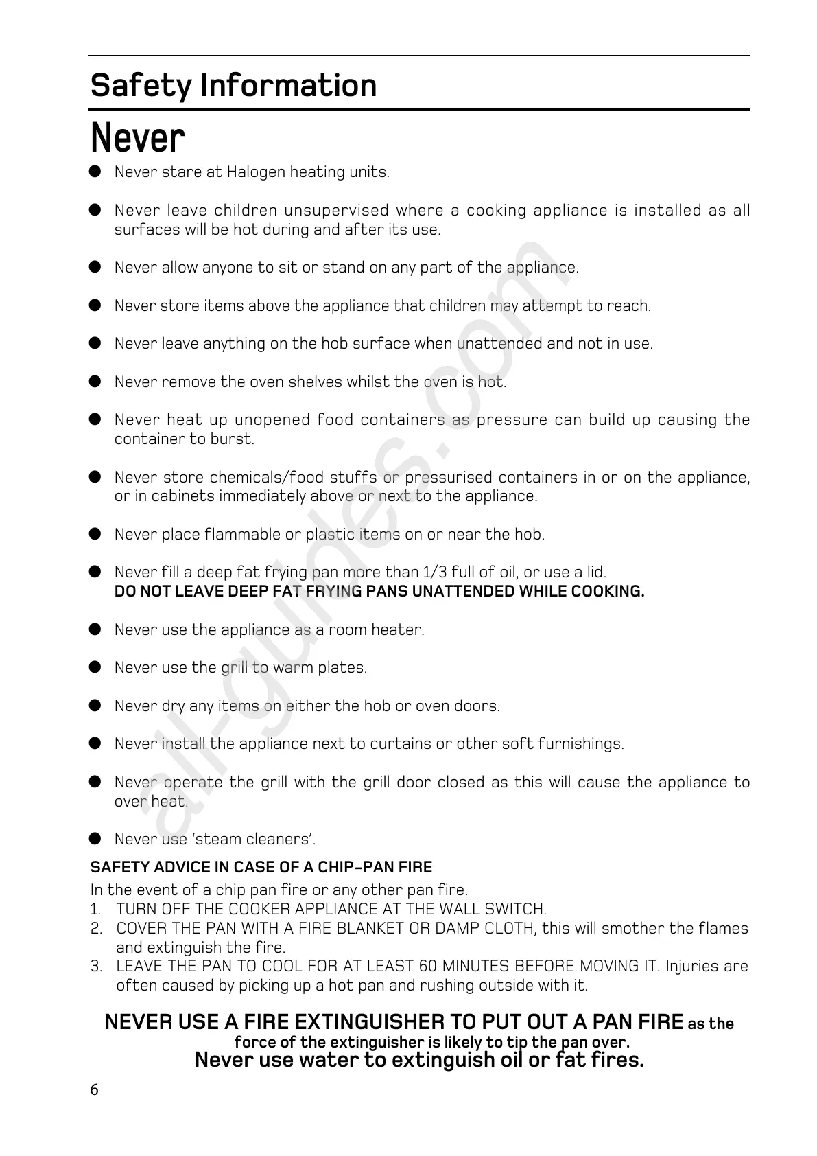● Never fill a deep fat frying pan more than 1/3 full of oil, or use a lid.