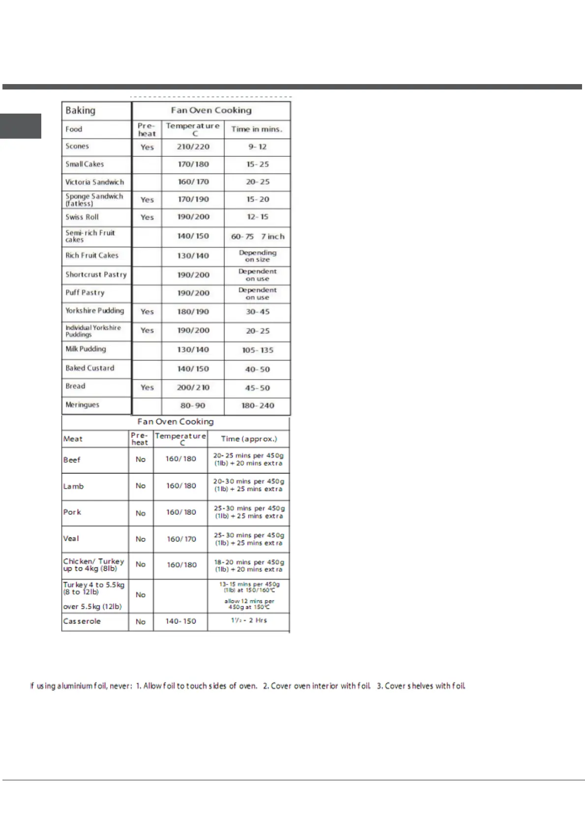 Oven Cooking Charts - Main Oven