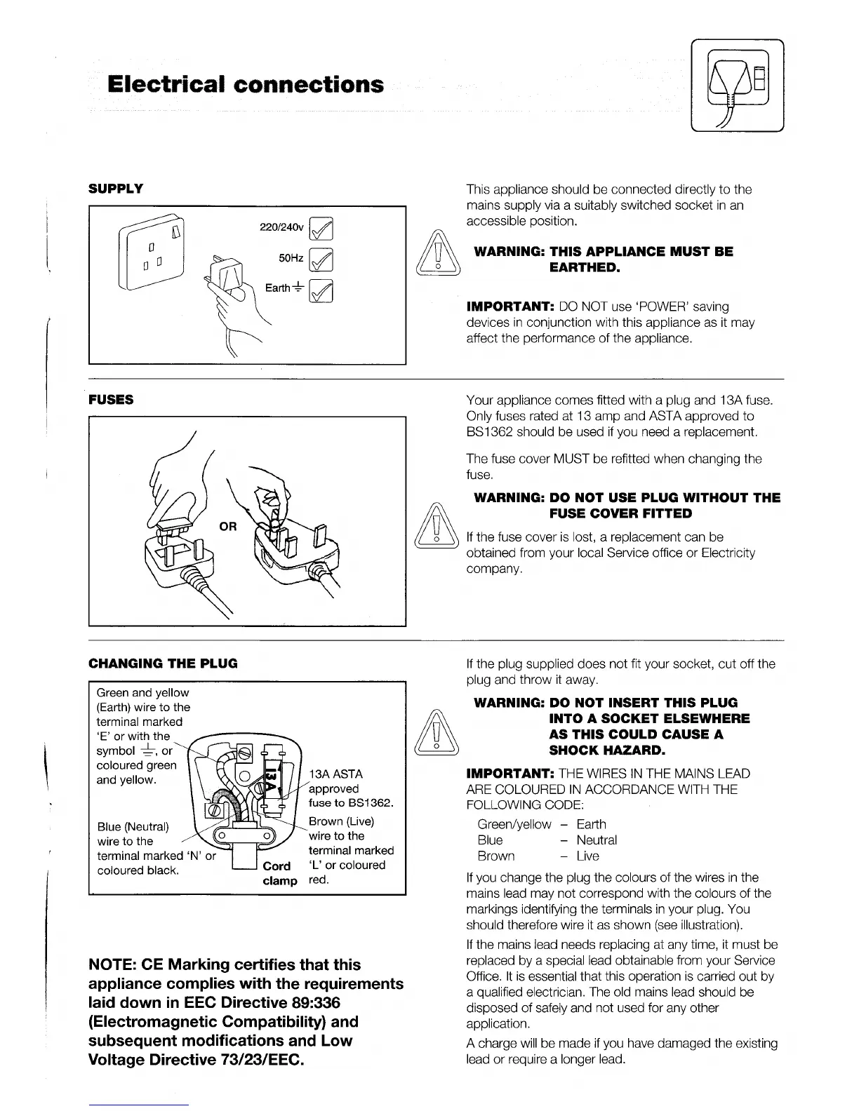 Hotpoint MISTRAL PLUS 8496 - Electrical Connections; Supply and Fuses; Changing the Plug