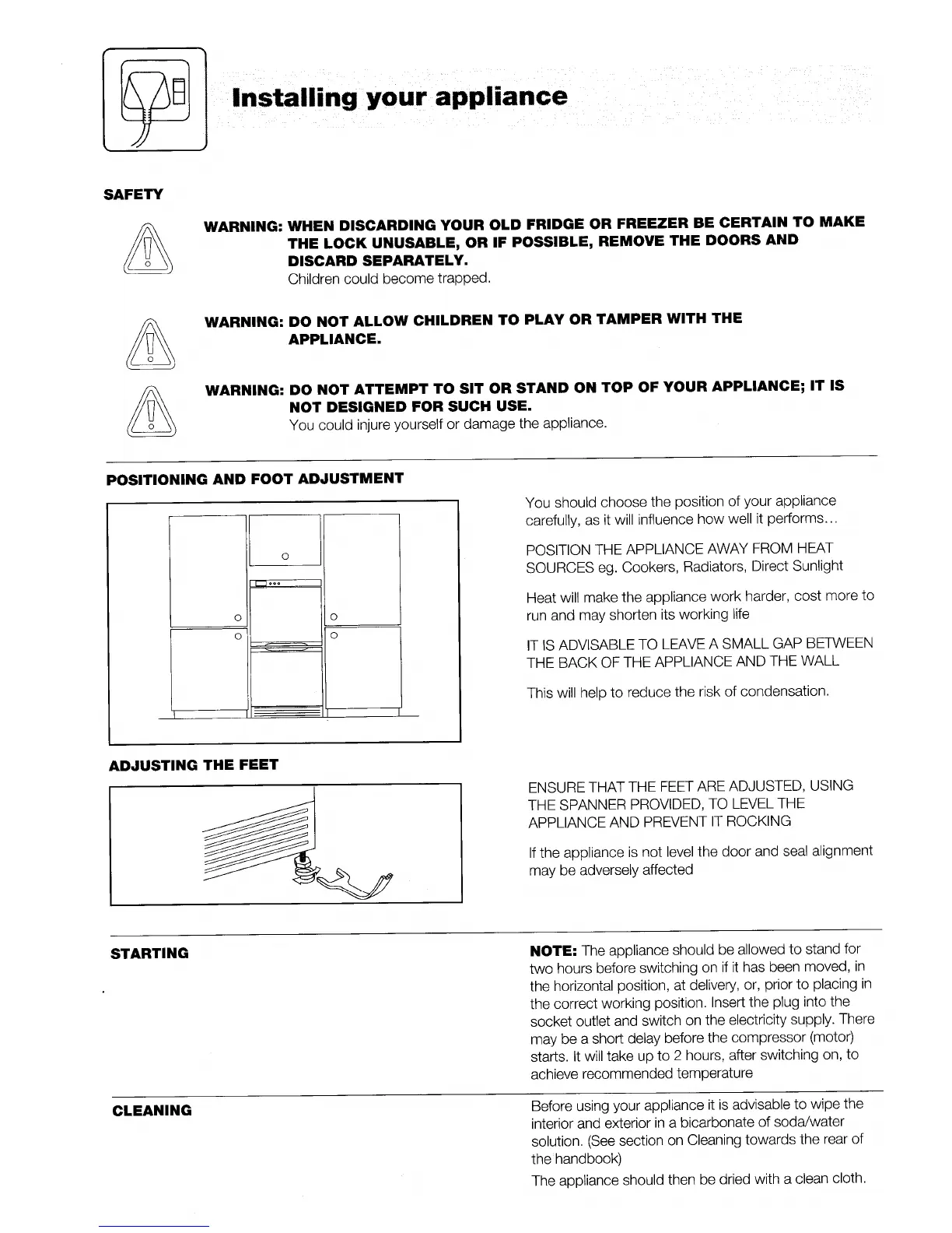 Hotpoint MISTRAL PLUS 8496 - Installing Your Appliance; Safety Precautions; Positioning and Foot Adjustment; Starting and Initial Cleaning