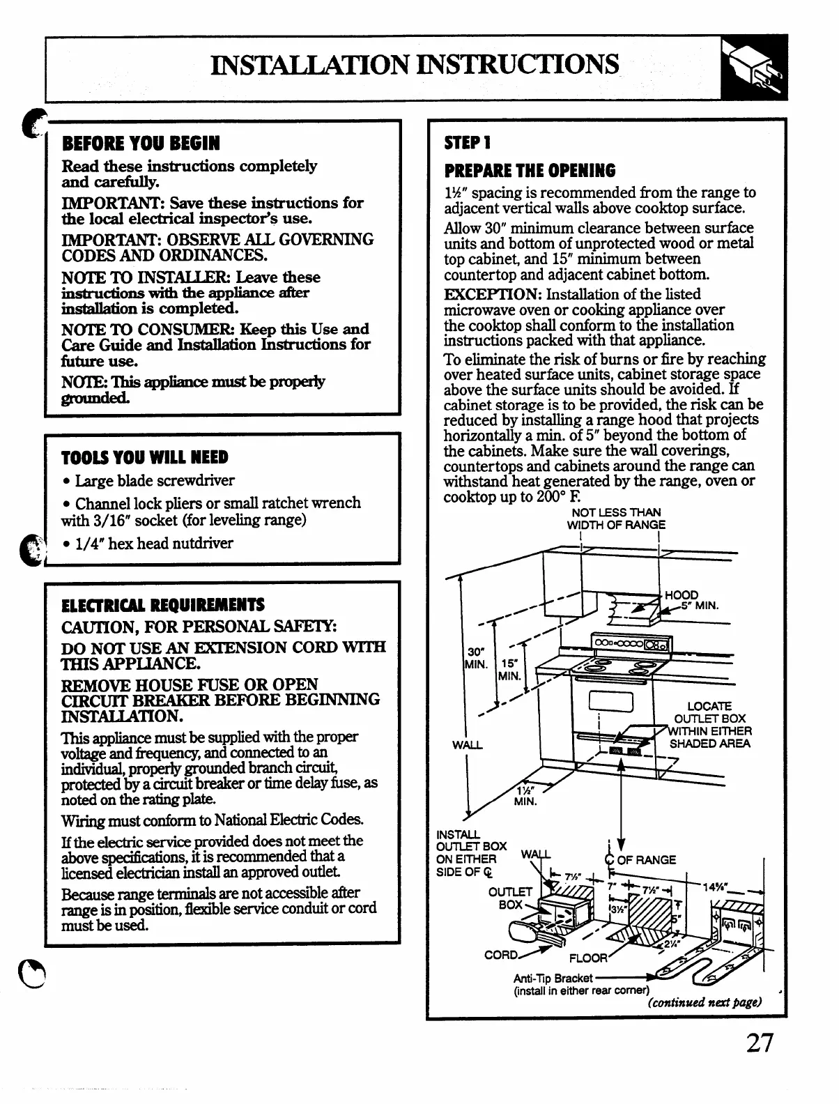 range is in position, flexible service conduit or cord