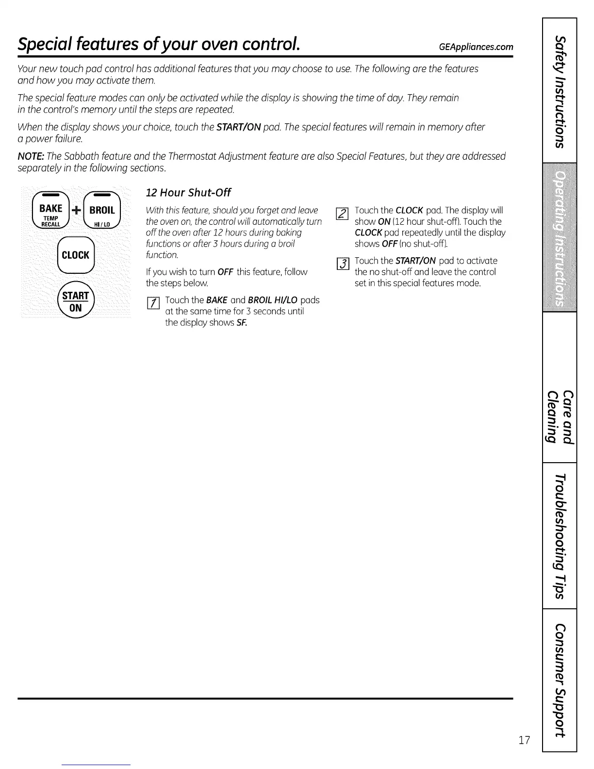 NOTE: The Sabbath feature and the Thermostat Adjustment feature are also Special Features, but they are addressed
