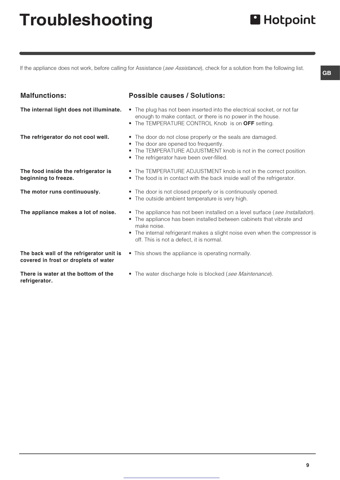 If the appliance does not work, before calling for Assistance (see Assistance), check for a solution from the following list.