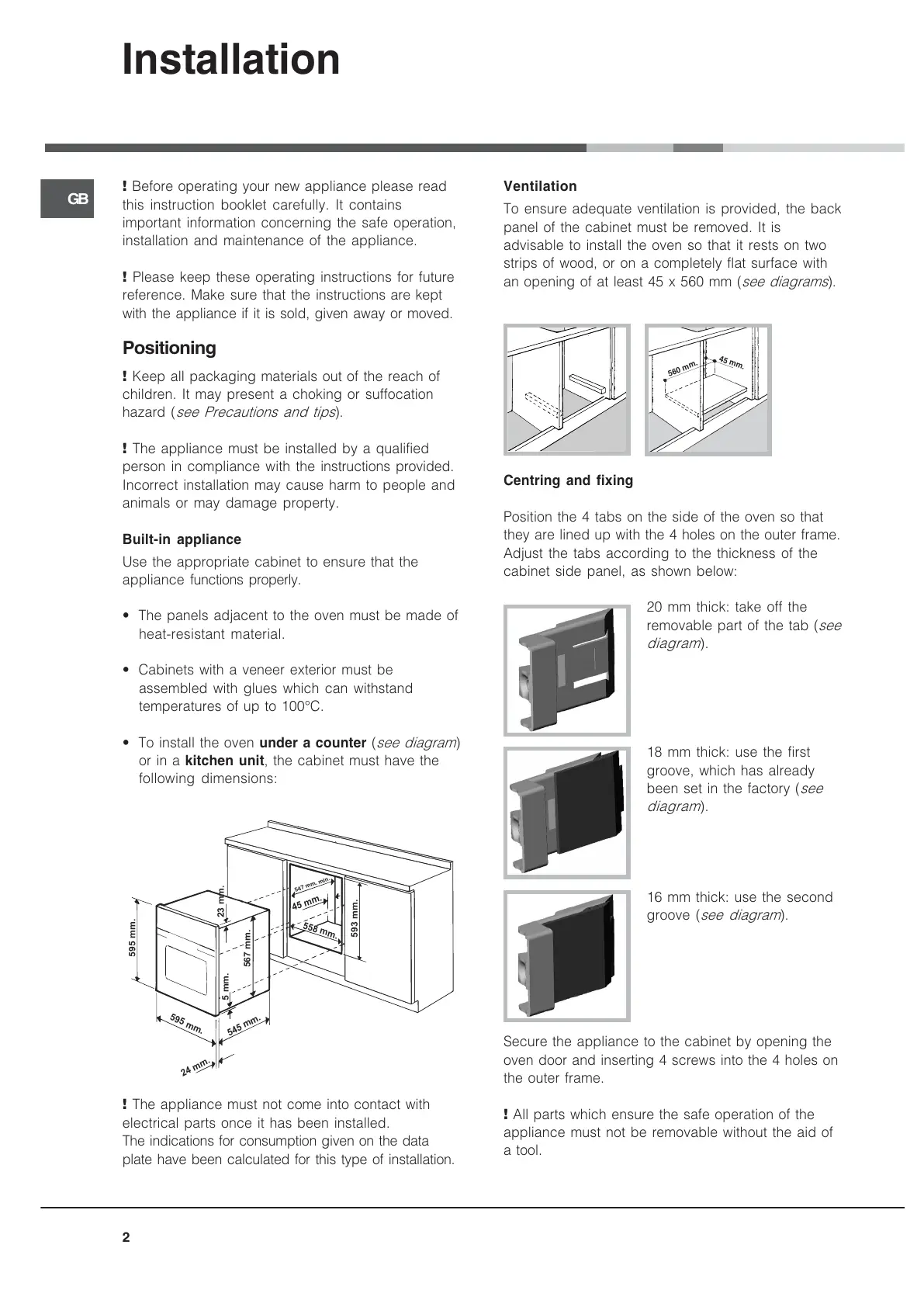 advisable to install the oven so that it rests on two