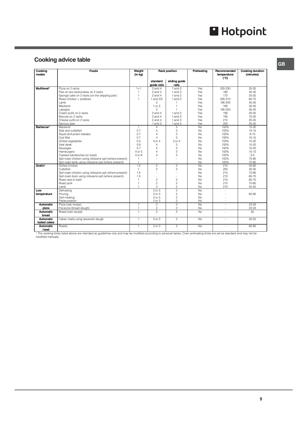 * The cooking times listed above are intended as guidelines only and may be modified according to personal tastes. Oven preheating times are set as standard and may not be