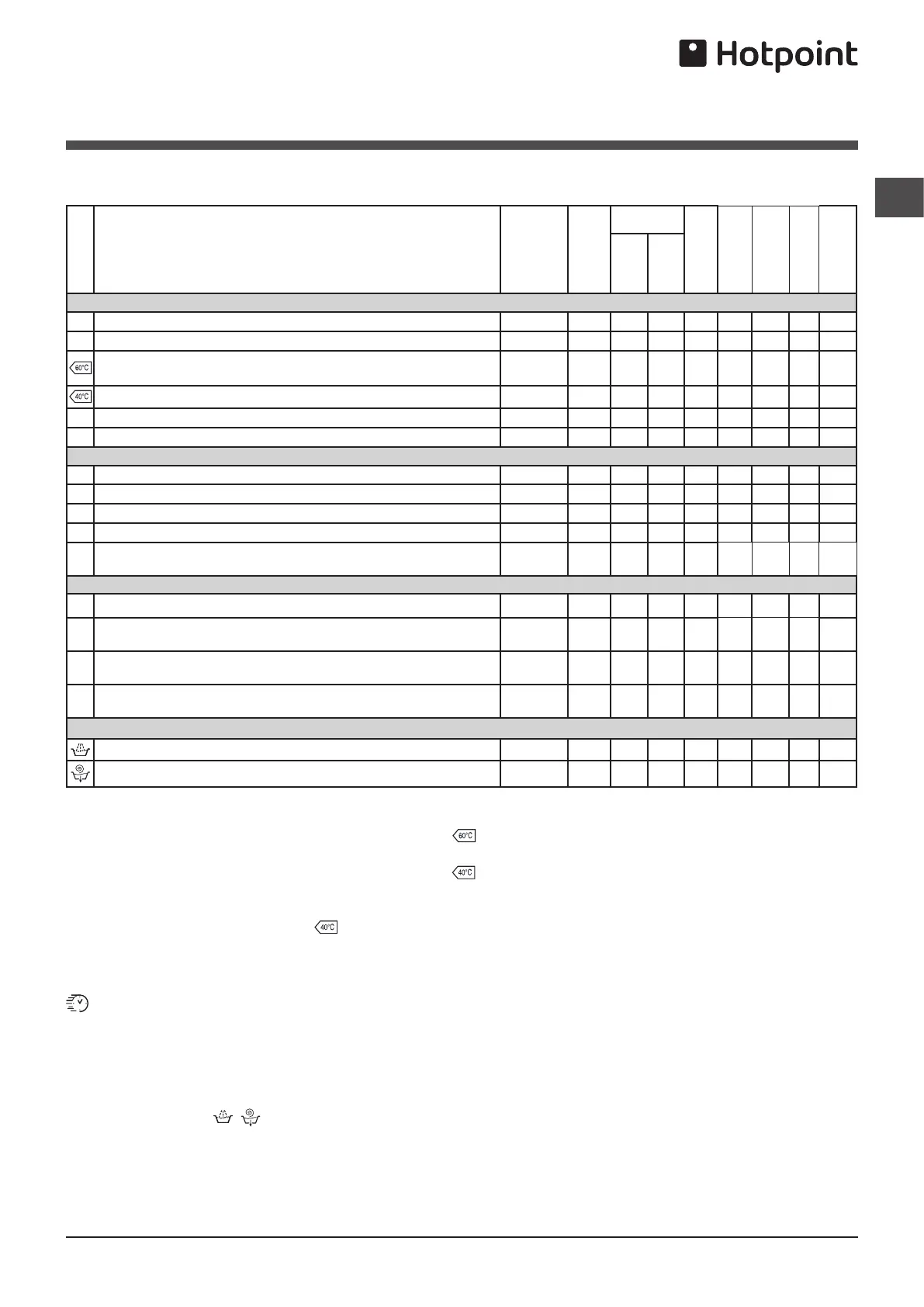 Table of programmes and wash cycles