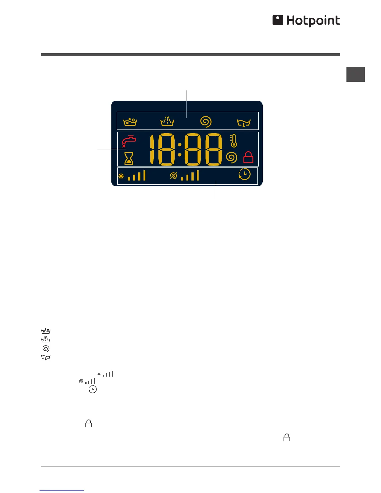 The icons corresponding to “temperature”, “spin” and “delayed start” (working from the left) are displayed in section C.