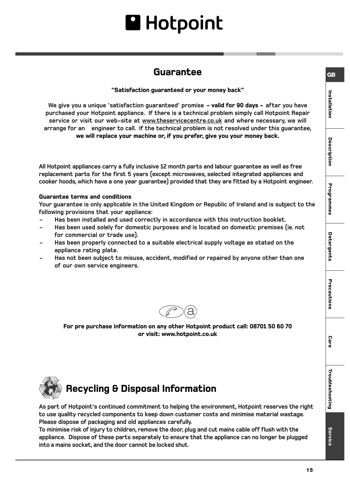 For pre purchase information on any other Hotpoint product call: 08701 50 60 70